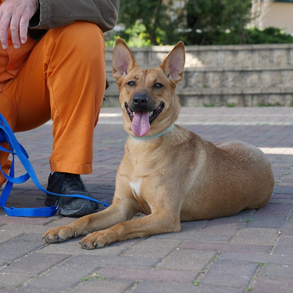 פינצ׳רית מעורבת בינונית, בעלת פרווה חום בהיר עם לבן, אוזניים זקוקות עומדת ליד אסיר לבוש בכתום.